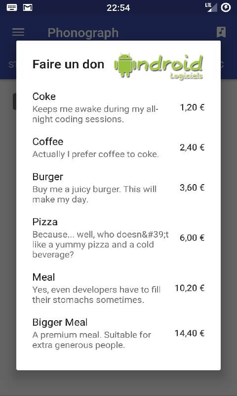 Le lecteur Phonograph est gratuit, le menu principal vous donnera cependant la possibilité de faire un donc au développeur si vous en avez envie