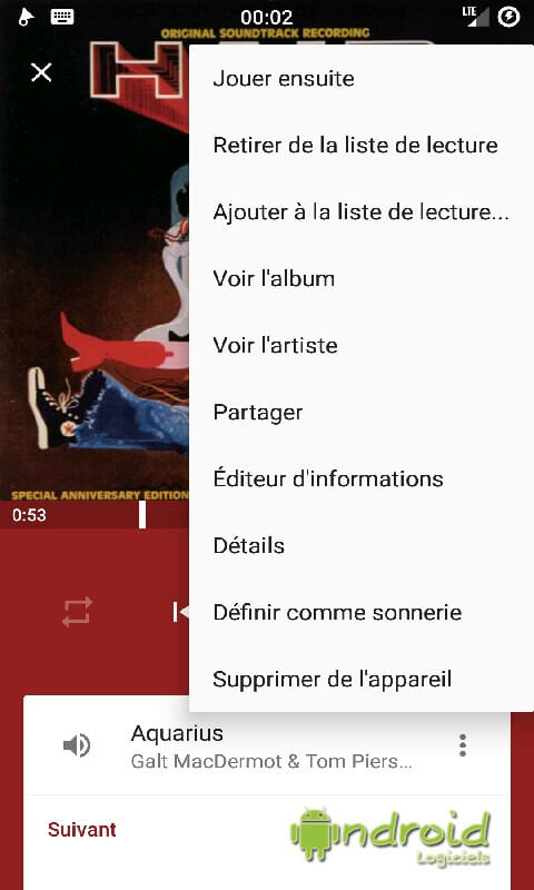 Un appui bref sur un titre lancera sa lecture, durant laquelle il vous sera ensuite possible de profiter de différentes fonctions disponibles dans chacun des sous-menus de vos morceaux de musique (ajouter à votre liste de lecture ou à une autre liste, consulter les informations et détail du titre, de définir ce dernier comme sonnerie voire même de l'écouter pour vous endormir grâce au timer intégré).